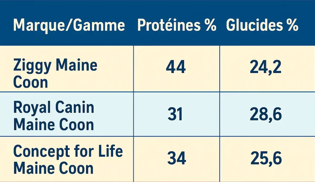 ➡️ À noter : plusieurs marques proposent des gammes “spécial Maine Coon”, comme Royal Canin ou Concept for Life. Mais leur teneur en protéines est souvent inférieure et le ratio glucides/protéines moins adapté.