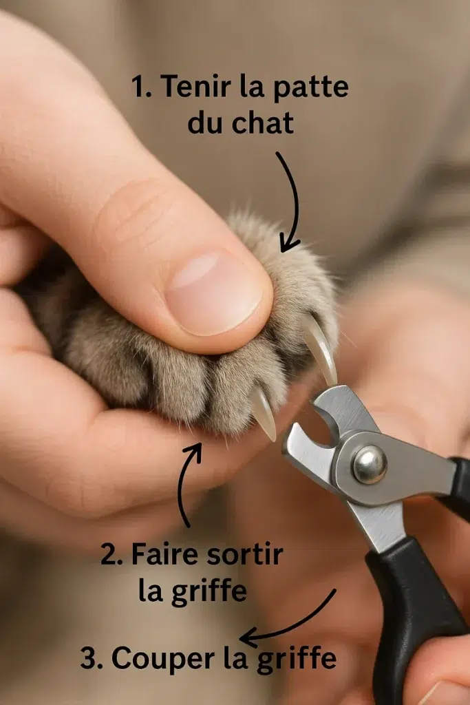 Après avoir trouver un endroit calme et une position confortable, presser le coussinet entre le pouce et l’index, la griffe sortira toute seule. Il ne vous reste plus qu’à couper la partie blanche en évitant la zone rosée.