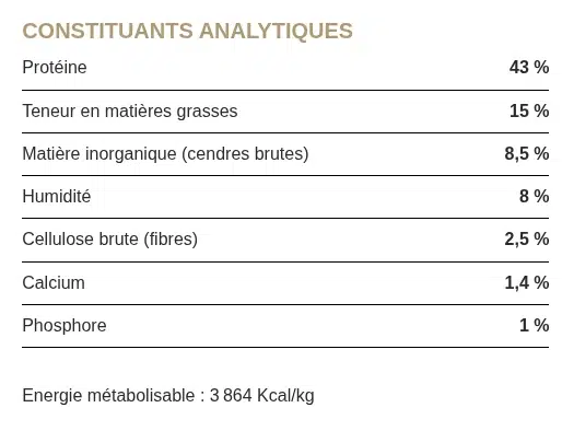 • Protéines : recommandées entre 25 % et 30 % → ici 43 % 🟢