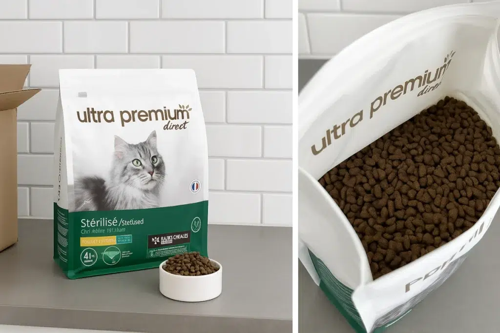Ultra Premium Direct se distingue de Royal Canin par son approche « no grains » et ses recettes composées à 70 % d’ingrédients d’origine animale, sans additifs artificiels. La marque vend directement en ligne, avec des tarifs légèrement plus abordables, des offres d’abonnement et des codes promo proposés assez régulièrement.